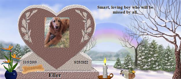 I am so sorry to hear about your loss of Eller. Please find comfort in knowing that Eller is now at Rainbows Bridge and making lots of friends. Saying goodbye is never easy. I also lost my precious cat Spooky July 30th 2001 after 16 wonderful years with her. I have lost several babies since Spooky's passing. Hannah 1/11/13, Sammi 8/2/13,Maci 4/9/14, Gabbi 3/20/17, Zoe 1/3/18, Willow 6/4/18, Shelby 6/12/18, Bear 11/17/19 and Bella and Murphy who were both tragically poisoned on 06/18/20. I am sure that Eller and my babies have all become good friends. You can visit with Spooky at: http://www.rainbowsbridge.com/residents/Spook002/resident.HTM Take Care, Susan