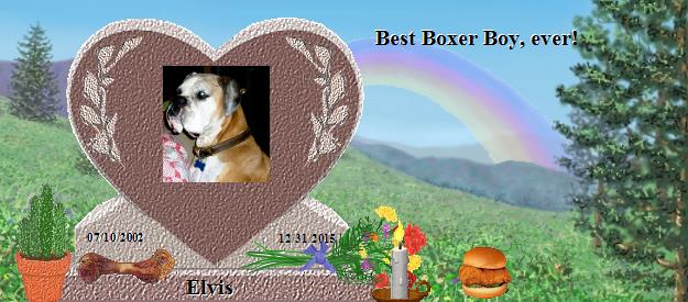 Hello there Elvis , I was just visiting some of my babies here at the bridge and wanted to stop in for a visit, I am trying to visit all the boxer pups here at the bridge. I have a beautiful Boxer girl named Bella laying at my right as I type this. You see Elvis I have a rag tag bunch here at the bridge but this is the first Boxer that God has granted me the honor of calling mine. I will never be without a Boxer in my heart ever!! You guys have a human like love that surpasses anything I have ever known so I know that your humans must miss you lots even now. So don't forget to send them a sign every now and again to let them know you are with them always just inside their hearts until you are together again.