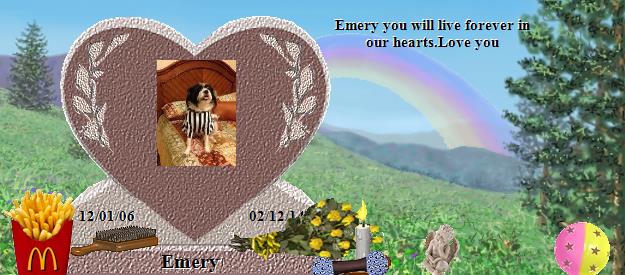 Dear Emery, you are truly beautiful! Please go to the Bridge and send your precious love down the Rainbow straight into the hearts of your family who miss you so much, and they will send their love right back to you on angels' wings. Dear Sally, Jessica and Judy, your world has lost a very special furperson, family member and friend, and heaven has welcomed Home a very special soul. Emery, along with Aro, is now your very own angel, watching over and for you, just as Tashi, Katy and BG are watching over us, until you meet again and cross the Bridge together. May their sweet love continually nuzzle your hearts until then, and may you find comfort in knowing that the silver thread of love that binds you heart to heart with Emery and Aro will never be broken. Many blessings and much peace, Clare and Martha...Please visit our Tashi at http://www.rainbowsbridge.com/residents/TASHI002/resident.HTM