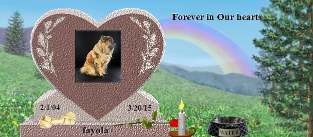 Dear Fayola, you are truly cherished. Please go to the Bridge and send your precious love down the Rainbow straight into the hearts of your mom and dad who miss you so much, and they will send their love right back to you on angels' wings. Dear Heidi and Stan, your world has lost a very special furperson, family member and friend, and heaven has welcomed Home a very special soul. Fayola is now your very own angel, watching over and for you, just as Tashi, Katy and BG are watching over us, until you meet again and cross the Bridge together. May her sweet love continually nuzzle your hearts until then, and may you find comfort in knowing that the silver thread of love that binds you heart to heart with Fayola will never be broken. Many blessings and much peace, Clare and Martha...Please visit our Tashi at http://www.rainbowsbridge.com/residents/TASHI002/resident.HTM