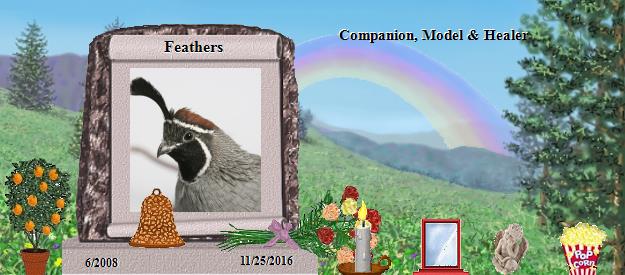 Hi there Feathers my boy! Hope all is happy and peaceful for you up there. I miss you and think of you an awful lot. They are closing Jays Bird Barn where you visited. Now all the stoes where you worked are all in memory. All your quail friends are doing fine. Have you been spending time with Big Boy? Love you sweetheart! Mom