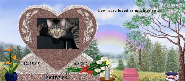 I am so sorry to hear about your loss of Fenwyck. Please find comfort in knowing that Fenwyck is now at Rainbows Bridge and making lots of friends. Saying goodbye is never easy. I also lost my precious cat Spooky July 30th 2001 after 16 wonderful years with her. I have lost several babies since Spooky's passing. Hannah 1/11/13, Sammi 8/2/13,Maci 4/9/14, Gabbi 3/20/17, Zoe 1/3/18, Willow 6/4/18, Shelby 6/12/18, Bear 11/17/19 and Bella and Murphy who were both tragically poisoned on 06/18/20. I am sure that Fenwyck and my babies have all become good friends. You can visit with Spooky at: http://www.rainbowsbridge.com/residents/Spook002/resident.HTM Take Care, Susan