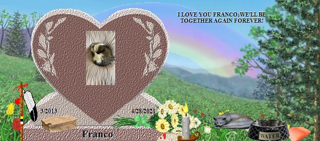 Dear Franco, how purrfectly handsome you are! Please go to the Bridge and purr your precious love down the Rainbow straight into the heart of your mommy who misses you so much, and she will send her love right back to you on angels' wings. Dear Sandra, your world has lost a very special furpurrson, family member and friend, and heaven has welcomed Home a very special soul. Franco is now your very own angel, watching over and for you, just as Jackie, Callie, Tashi, Katy and BG are watching over us, until you meet again and cross the Bridge together. May his sweet presence continually nuzzle your heart until then, and may you find comfort in knowing that the silver thread of love that binds you heart to heart with Frankie Bear will never be broken. Many blessings and much peace, Clare and Martha...Please visit our Jackie at https://www.rainbowsbridge.com/residents/JACKI010/resident.HTM