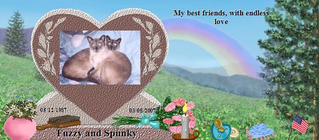 Spunky and Fuzzy - what loving, loyal and gentle companions you were to Donna, Kristin, Bill, Lana, and Jason. Send all of them some kisses from the Rainbow and let them know you two are safe, happy, healthy and together again. Let all of the family know that God has appointed all of you to be the guardian and protectors to watch over them until they are called to the Bridge. I will tell my Brande to find you and play with you. To Donna, Kristin, Bill, Lana and Jason - I send you all of my sympathy at this time in your great loss. I too lost my soulmate not long ago, see Brande