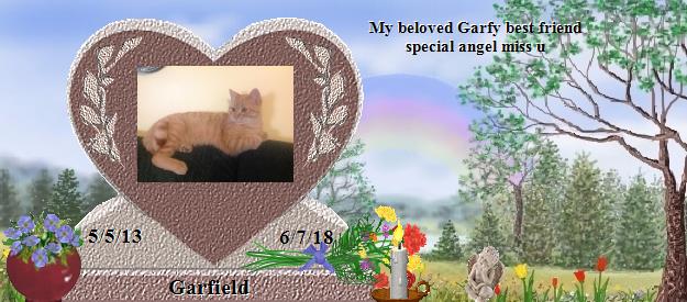 I am so sorry to hear about your loss of Garfield. Please find comfort in knowing that Garfield is now at Rainbows Bridge and making lots of friends. Saying goodbye is never easy. I also lost my precious cat Spooky July 30th 2001 after 16 wonderful years with her. I have lost several babies since Spooky's passing. Hannah 1/11/13, Sammi 8/2/13,Maci 4/9/14, Gabbi 3/20/17, Zoe 1/3/18, Willow 6/4/18, and Shelby 6/12/18. I am sure that Garfield and my babies have all become good friends. You can visit with Spooky at: http://www.rainbowsbridge.com/residents/Spook002/resident.HTM Take Care, Susan