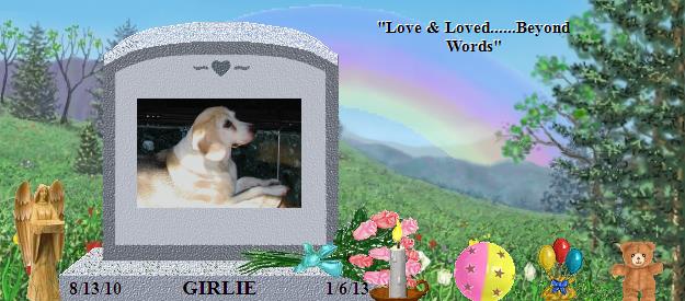 "God gave us our memories so that we might have Roses in December." a quote by J.M. Barrie. May the memories of your blessed furangel, the ones that can't help but bring a smile to your face and a chuckle to your heart as you remember how your baby’s paw prints touched your life, be the ones that bloom in your heart this Holiday Season. My prayer for all of us this blessed season, is that each of our babies wrap up a special little sign for each one of us back here, and send it to us during the Holidays. May you catch a glimpse of your special sign, just when your heart needs it the most....And may each love-filled memory you have of your beloved pooch, Girlie, bring to your heart the very warmth and sunshine of the Rainbow itself. That's just one "gift" your baby-angel would want for you this year...God bless, and best wishes for you and your family this Holiday Season, Karen (Dusty, DJ, Patches, and Momma’s mom) http://RainbowsBridge.com/residents/DUSTY101/Resident.htm