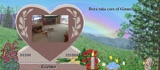 Dear Gizmo, you are truly handsome. Please go to the Bridge and send your precious love down the Rainbow straight into the hearts of your mommy and daddy who miss you so much, and they will send their love right back to you on angels' wings. Dear Patty and Howard, your world has lost a very special furperson, family member and friend, and heaven has welcomed Home a very special soul. Gizmo, along with Dora, is now your very own angel, watching over and for you, just as Tashi, Katy and BG are watching over us, until you meet again and cross the Bridge together. May their sweet love continually nuzzle your hearts until then, and may you find comfort in knowing that the silver thread of love that binds you heart to heart with Gizmo and Dora will never be broken. Many blessings and much peace, Clare and Martha...Please visit our Tashi at http://www.rainbowsbridge.com/residents/TASHI002/resident.HTM