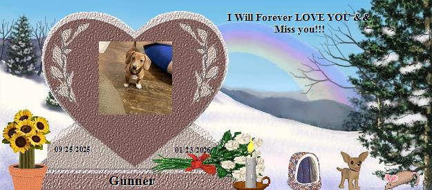 Dear Gunner, you are truly handsome. Please go to the Bridge and send your precious love down the Rainbow straight into the heart of Leddie who misses you so much and much love will be sent right back to you on angels' wings. Dear Leddie, your world has lost a very special furperson, family member and friend, and heaven has welcomed Home a very special soul. Gunner is now your very own angel, watching over and for you, just as Fritz, Jackie, Callie, Tashi, Katy and BG are watching over me, until you meet again and cross the Bridge together. May his sweet presence continually nuzzle your heart until then, and may you find comfort in knowing that the silver thread of love that binds you heart to heart with Gunner will never be broken. Many blessings and much peace, Clare...Please visit my Fritz at https://www.rainbowsbridge.com/residents/FRITZ021/resident.htm