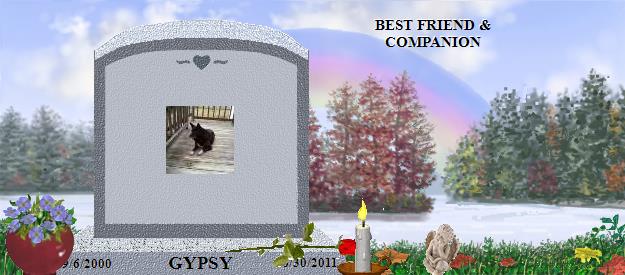I am so sorry to hear about your loss of Gypsy. Please find comfort in knowing that Gypsy is now at Rainbows Bridge and making lots of friends. Saying goodbye is never easy. I also lost my precious cat Spooky July 30th 2001 after 16 wonderful years with her. I am sure that Gypsy and Spooky have become good friends. You can visit with Spooky at: http://www.rainbowsbridge.com/residents/Spook002/resident.HTM Take Care, Susan