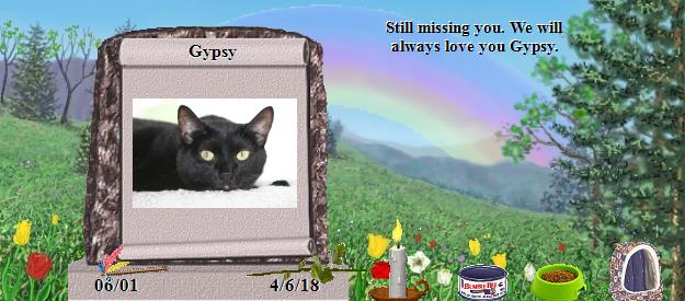I am so sorry to hear about your loss of Gypsy. Please find comfort in knowing that Gypsy is now at Rainbows Bridge and making lots of friends. Saying goodbye is never easy. I also lost my precious cat Spooky July 30th 2001 after 16 wonderful years with her. On January 11, 2013, I lost my faithful friend Hannah who was a beautiful blue tick hound dog. On August 2, 2013 another one of my beautiful cats, Sammi, a black and white tabby, went to Rainbows Bridge. April 9, 2014, Maci, my English Bulldog passed over to Rainbows Bridge. Maci and Hannah were best friends. On March 20, 2017 my sweet little calico Gabbi crossed over Rainbow's Bridge. I adopted her about a month after Spooky passed away and Gabbi also lived to be almost 16 years old. On 1/3/18 my little cat Zoe passed away. I am sure that Gypsy and my babies have all become good friends. You can visit with Spooky at: http://www.rainbowsbridge.com/residents/Spook002/resident.HTM Take Care, Susan
