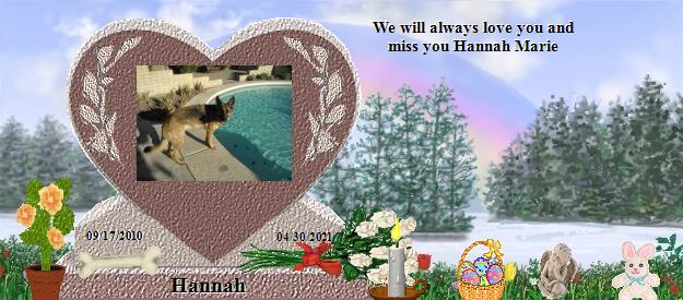 Dear Hannah Marie, you are truly beautiful. Please go to the Bridge and send your precious love down the Rainbow straight into the heart of your mom and dad who miss you so much, and they will send their love right back to you on angels' wings. Dear Greg and Jane, your world has lost a very special furperson, family member and friend, and heaven has welcomed Home a very special soul. Hannah is now your very own angel, watching over and for you, just as Jackie, Callie, Tashi, Katy and BG are watching over us, until you meet again and cross the Bridge together. May her sweet presence continually nuzzle your hearts until then, and may you find comfort in knowing that the silver thread of love that binds you heart to heart with Hannah will never be broken. Many blessings and much peace, Clare and Martha...Please visit our Jackie at https://www.rainbowsbridge.com/residents/JACKI010/resident.HTM