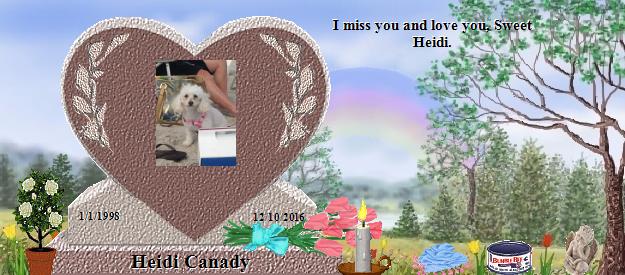 Hi Shannon, I'm so sorry for your loss💐.Heidi is at peace and is now an angel in heaven. I recently loss my beloved Carshion and I understand the void we feel after losing our beloved pets💙❤️ Heidi & Carshion are our fur-angels in rainbows meadow, still being loyal & waiting for us at rainbow bridge. For Beautiful Heidi, Rest in peace, your mommy created a loving memorial for you here at Rainbow Bridge and she misses you very much. Let her know that your love, bond & memory lives on for eternity. Take sweet care until we all meet beyond the clouds. I left A pointsetta plant as a symbol that your spirit continues to flower now and forever❤️💙. From Carshion's mom. Feel free to visit my beloved Carshion's memorial at http://RainbowsBridge.com/residents/CARSH001/Resident.htm