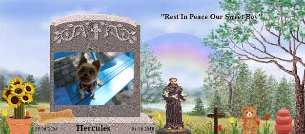 I am so sorry to hear about your loss of Hercules. Please find comfort in knowing that Hercules is now at Rainbows Bridge and making lots of friends. Saying goodbye is never easy. I also lost my precious cat Spooky July 30th 2001 after 16 wonderful years with her. On January 11, 2013, I lost my faithful friend Hannah who was a beautiful blue tick hound dog. On August 2, 2013 another one of my beautiful cats, Sammi, a black and white tabby, went to Rainbows Bridge. April 9, 2014, Maci, my English Bulldog passed over to Rainbows Bridge. Maci and Hannah were best friends. I am sure that Hercules and my babies have all become good friends. You can visit with Spooky at: http://www.rainbowsbridge.com/residents/Spook002/resident.HTM Take Care, Susan