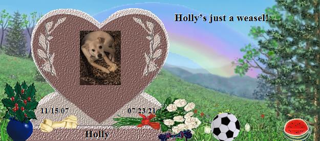 Hey Hol: Today marks 49 months since you departed for the Rainbow Bridge. Holly’s just a weasel, a baby weasel!! That’s what I shout out every day so you can hear me and that makes me feel good. I miss you as much as always and never have a day when I don’t think about you. I hope you are well and having fun playing ball with Ollie, Patches and all of your friends at the Bridge. I love you with all my heart and always will. Until…Daddy