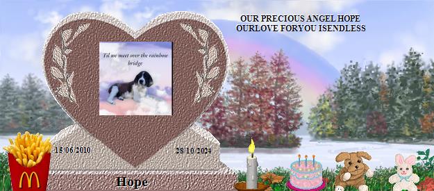 I am so sorry to hear about your loss of Hope. Please find comfort in knowing that Hope is now at Rainbows Bridge and making lots of friends. Saying goodbye is never easy. I also lost my precious cat Spooky July 30th, 2001, after 16 wonderful years with her. I have lost several babies since Spooky's passing. Hannah 1/11/13, Sammi 8/2/13, Maci 4/9/14, Gabbi 3/20/17, Zoe 1/3/18, Willow 6/4/18, Shelby 6/12/18, Bear 11/17/19, Bella and Murphy who were both tragically poisoned on 06/18/20, Firefly 12/20/22, Zachary 02/19/23, Tanner 02/22/24 and Tiger 08/01/24. I am sure that Hope and my babies have all become good friends. You can visit with Spooky at: http://www.rainbowsbridge.com/residents/Spook002/resident.HTM Take Care, Susan