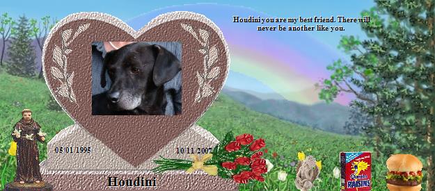Dearest Pat, I'm so glad you found this site. Your memorial is beautiful. (I saw the little treats) The messages that people sent you were very moving to me & I,m sure you were touched also. I love to think that our loved ones are somehow watching over us and that we will see them again. A friend told me about Buddy that he's now bounding around the universe having a great time. Houdini knew how much you loved him and you know how much he loved you. That's something you will always have; and hopefully you and he will be bounding around the universe together one day, stopping occasionally for a hamburger. Love always, Laura