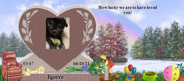 Dear Igorre, you are truly handsome. Please go to the Bridge and send your precious love down the Rainbow straight into the hearts of your mom and dad who miss you so much, and they will send their love right back to you on angels' wings. Dear Kimberly and Steve, your world has lost a very special furperson, family member and friend, and heaven has welcomed Home a very special soul. Igorre, along with Tiffany, is now your very own angel, watching over and for you, just as Jackie, Callie, Tashi, Katy and BG are watching over us, until you meet again and cross the Bridge together. May their sweet presence continually nuzzle your hearts until then, and may you find comfort in knowing that the silver thread of love that binds you heart to heart with Igorre and Tiffany will never be broken. Many blessings and much peace, Clare and Martha...Please visit our Jackie at https://www.rainbowsbridge.com/residents/JACKI010/resident.HTM