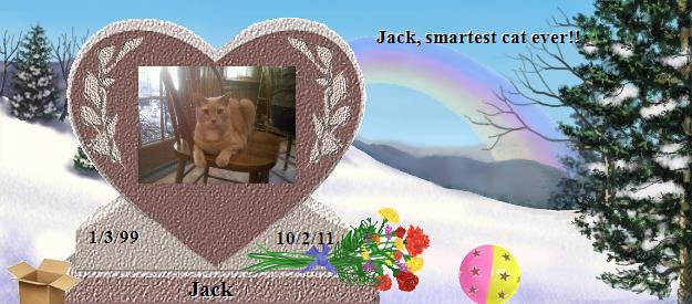 I am so sorry to hear about your loss of Jack. Please find comfort in knowing that Jack is now at Rainbows Bridge and making lots of friends. Saying goodbye is never easy. I also lost my precious cat Spooky July 30th 2001 after 16 wonderful years with her. I am sure that Jack and Spooky have become good friends. You can visit with Spooky at: http://www.rainbowsbridge.com/residents/Spook002/resident.HTM Take Care, Susan