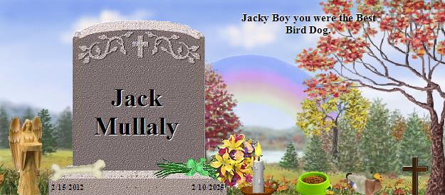 I am very sorry for your loss of Jack Mullaly. I hope the joyful memories will bring some comfort during this difficult time as you adjust to new routines without your friend. Play hard at the Bridge Jack and chase those birds.