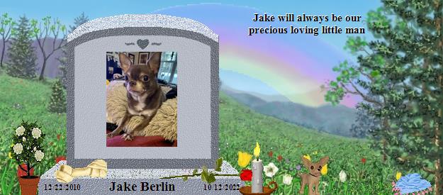 Carolyn & Philip - I am so sorry for your loss of Jake Berlin - such a sweet tribute to his life with you. I can feel the love you all had for each other and it still goes on - he's your little fur angel now- His spirit is still with you, making sure you're alright. I offer you my hugs, peace & prayers to help ease your pains. Nancy