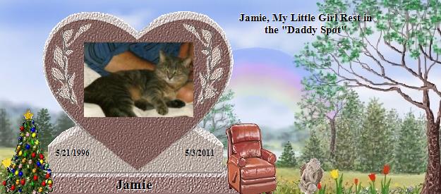 Hi Jim, What an amazing special girl Jamie is. I have just read your memorial page, and see that your love for her remains the same as ever. Such a beautiful girl, and a dear friend to you. Your consistent love and missing of Jamie, is of comfort to myself. You help me to feel normal, and more accepting of my heartache missing my beautiful cat Bella, who I lost nearly two years ago💔