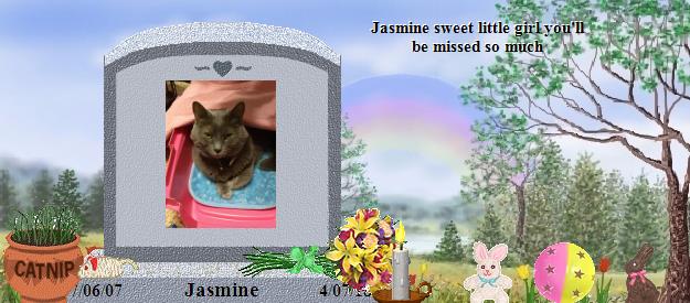 Dear Jasmine, how purrfectly beautiful you are! Please go to the Bridge and purr your precious love down the Rainbow straight into the heart of your momma who misses you so much, and she will send her love right back to you on angels' wings. Dear Dee, your world has lost a very special furpurrson, family member and friend, and heaven has welcomed Home a very special soul. Jasmine, along with Harmony, is now your very own angel, watching over and for you, just as Tashi, Katy and BG are watching over us, until you meet again and cross the Bridge together. May their sweet presence continually nuzzle your heart until then, and may you find comfort in knowing that the silver thread of love that binds you heart to heart with Jasmine and Harmony will never be broken. Many blessings and much peace, Clare and Martha...Please visit our Tashi at http://www.rainbowsbridge.com/residents/TASHI002/resident.HTM
