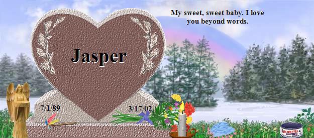 Jasper, What a precious baby you were, always so loyal and loving.You taught and gave your mommy so much that she now knows the true meaning of unconditional love.She longs for the day to be able to hold you and to look into your eyes again.I know just how grateful you are for all of love and care in which she provided you.She misses you baby, so very much. I know that you don't want her to be sad for too long, but instead, be happy. For you are happy, content at peace and have been surrounded by so many others who also love and adore you, including my Shayna Girl, Leche and Si. I extend my deepest condolences to you for the loss of Jasper. I know just how painful it is to have lost your angel, for, I too, lost mine. Please vist my Shayna Girl at: http://rainbowsbridge.com/residents/SHAYN005/Resident.htm. My thoughts and prayers are with you. Until we are with our babies again. Shayna, Leche and Si's mommy, Lisa