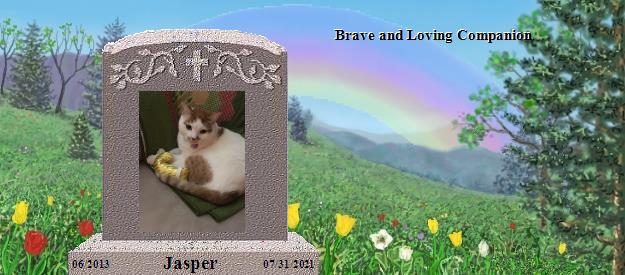 Dear Jasper, how purrfectly gorgeous you are! Please go to the Bridge and purr your precious love down the Rainbow straight into the heart of your daddy who misses you so much, and he will send his love right back to you on angels' wings. Dear Kevin, your world has lost a very special furpurrson, family member and friend, and heaven has welcomed Home a very special soul. Jasper is now your very own angel, watching over and for you, just as Jackie, Callie, Tashi, Katy and BG are watching over us, until you meet again and cross the Bridge together. May his sweet presence continually nuzzle your heart until then, and may you find comfort in knowing that the silver thread of love that binds you heart to heart with Jasper will never be broken. Many blessings and much peace, Clare and Martha...Please visit our Jackie at https://www.rainbowsbridge.com/residents/JACKI010/resident.HTM