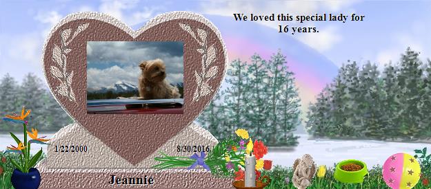 Dear Jeannie, you are truly beautiful. Please go to the Bridge and send your precious love down the Rainbow straight into the hearts of your mom and dad who miss you so much, and they will send their love right back to you on angels' wings. Dear Ted and Jo, your world has lost a very special furperson, family member and FURiend, and heaven has welcomed Home a very special soul. Jeannie is now your very own angel, watching over and for you, just as Tashi, Katy and BG are watching over us, until you meet again and cross the Bridge together. May her sweet love continually nuzzle your hearts until then, and may you find comfort in knowing that the silver thread of love that binds you heart to heart with Jeannie will never be broken. Many blessings and much peace, Clare and Martha...Please visit our Tashi at http://www.rainbowsbridge.com/residents/TASHI002/resident.HTM
