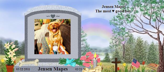 Dear Jensen Mapes, you are truly handsome. Please go to the Bridge and send your precious love down the Rainbow straight into the hearts of your family who miss you so much, and they will send their love right back to you on angels' wings. Dear Jim, Staci, Aynsley and Hudson, your world has lost a very special furperson, family member and friend, and heaven has welcomed Home a very special soul. Jensen is now your very own angel, watching over and for you, just as Jackie, Callie, Tashi, Katy and BG are watching over us, until you meet again and cross the Bridge together. May his sweet presence continually nuzzle your hearts until then, and may you find comfort in knowing that the silver thread of love that binds you heart to heart with Jensen will never be broken. Many blessings and much peace, Clare and Martha...Please visit our Jackie at https://www.rainbowsbridge.com/residents/JACKI010/resident.HTM