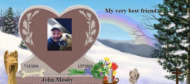 Dear John Mosby, you are truly handsome. Please go to the Bridge and send your precious love down the Rainbow straight into the heart of your dad who misses you so much, and he will send his love right back to you on angels' wings. Dear Richard, your world has lost a very special furperson, family member and friend, and heaven has welcomed Home a very special soul. John Mosby is now your very own angel, watching over and for you, just as Tashi, Katy and BG are watching over us, until you meet again and cross the Bridge together. May his sweet presence continually nuzzle your heart until then, and may you find comfort in knowing that the silver thread of love that binds you heart to heart with John Mosby will never be broken. Many blessings and much peace, Clare and Martha...Please visit our Tashi at http://www.rainbowsbridge.com/residents/TASHI002/resident.HTM