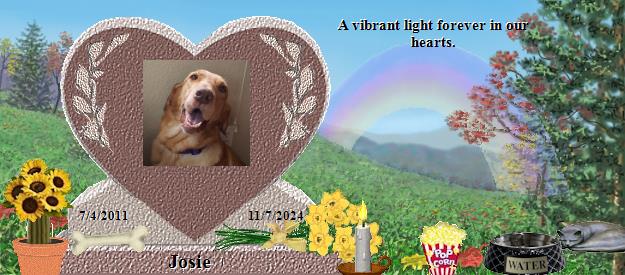 I am so sorry to hear about your loss of Josie. Please find comfort in knowing that Josie is now at Rainbows Bridge and making lots of friends. Saying goodbye is never easy. I also lost my precious cat Spooky July 30th, 2001, after 16 wonderful years with her. I have lost several babies since Spooky's passing. Hannah 1/11/13, Sammi 8/2/13, Maci 4/9/14, Gabbi 3/20/17, Zoe 1/3/18, Willow 6/4/18, Shelby 6/12/18, Bear 11/17/19, Bella and Murphy who were both tragically poisoned on 06/18/20, Firefly 12/20/22, Zachary 02/19/23, Tanner 02/22/24 and Tiger 08/01/24. I am sure that Josie and my babies have all become good friends. You can visit with Spooky at: http://www.rainbowsbridge.com/residents/Spook002/resident.HTM Take Care, Susan