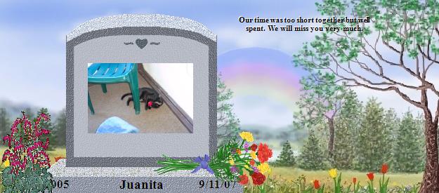 Juanita - you may not have spent a long time on this earth, but you are much loved. Send Abel some kisses from the Rainbow to let Abel know that you are safe, happy, healthy and will have many fur friends to play with now. Let Abel know that God has appointed you to be the guardian, protector to watch over until Abel is called to the Bridge to join you one day. I will tell my Brande to find you and play with you. To Abel - I send my sincere sympathy to you over the loss of Juanita. I too lost my soulmate not long ago, see Brande