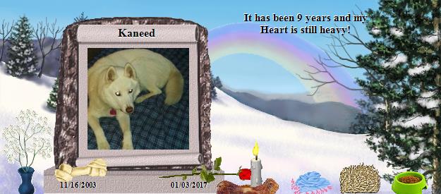 I am so sorry to hear about your loss of Kaneed. Please find comfort in knowing that Kaneed is now at Rainbows Bridge and making lots of friends. Saying goodbye is never easy. I also lost my precious cat Spooky July 30th 2001 after 16 wonderful years with her. On January 11, 2013, I lost my faithful friend Hannah who was a beautiful blue tick hound dog. On August 2, 2013 another one of my beautiful cats, Sammi, a black and white tabby, went to Rainbows Bridge. April 9, 2014, Maci, my English Bulldog passed over to Rainbows Bridge. Maci and Hannah were best friends. I am sure that Kaneed and my babies have all become good friends. You can visit with Spooky at: http://www.rainbowsbridge.com/residents/Spook002/resident.HTM Take Care, Susan