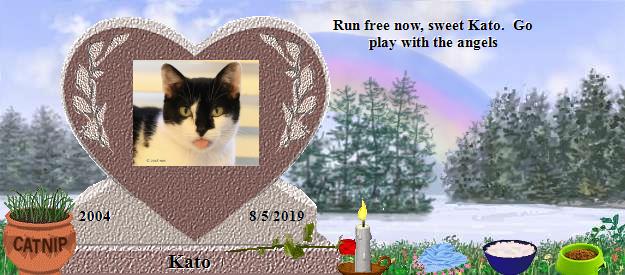 I am so sorry to hear about your loss of Kato. Please find comfort in knowing that Kato is now at Rainbows Bridge and making lots of friends. Saying goodbye is never easy. I also lost my precious cat Spooky July 30th 2001 after 16 wonderful years with her. I have lost several babies since Spooky's passing. Hannah 1/11/13, Sammi 8/2/13,Maci 4/9/14, Gabbi 3/20/17, Zoe 1/3/18, Willow 6/4/18, and Shelby 6/12/18. I am sure that Kato and my babies have all become good friends. You can visit with Spooky at: http://www.rainbowsbridge.com/residents/Spook002/resident.HTM Take Care, Susan