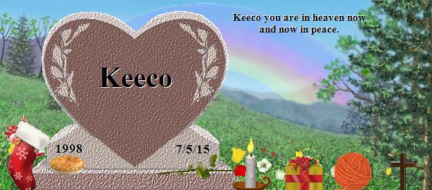 I am so sorry to hear about your loss of Keeco. Please find comfort in knowing that Keeco is now at Rainbows Bridge and making lots of friends. Saying goodbye is never easy. I also lost my precious cat Spooky July 30th 2001 after 16 wonderful years with her. On January 11, 2013, I lost my faithful friend Hannah who was a beautiful blue tick hound dog. On August 2, 2013 another one of my beautiful cats, Sammi, a black and white tabby, went to Rainbows Bridge. April 9, 2014, Maci, my English Bulldog passed over to Rainbows Bridge. Maci and Hannah were best friends. I am sure that Keeco and my babies have all become good friends. You can visit with Spooky at: http://www.rainbowsbridge.com/residents/Spook002/resident.HTM Take Care, Susan