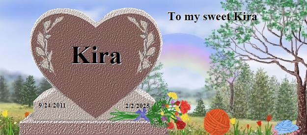 I am so sorry to hear about your loss of Kira. Please find comfort in knowing that Kira is now at Rainbows Bridge and making lots of friends. Saying goodbye is never easy. I also lost my precious cat Spooky July 30th, 2001, after 16 wonderful years with her. I have lost several babies since Spooky's passing. Hannah 1/11/13, Sammi 8/2/13, Maci 4/9/14, Gabbi 3/20/17, Zoe 1/3/18, Willow 6/4/18, Shelby 6/12/18, Bear 11/17/19, Bella and Murphy who were both tragically poisoned on 06/18/20, Firefly 12/20/22, Zachary 02/19/23, Tanner 02/22/24 and Tiger 08/01/24. I am sure that Kira and my babies have all become good friends. You can visit with Spooky at: http://www.rainbowsbridge.com/residents/Spook002/resident.HTM Take Care, Susan
