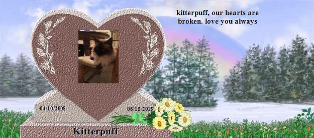 Dear Kitterpuff, how purrfectly handsome you are. Please go to the Bridge and purr your precious love down the Rainbow straight into the hearts of your family who miss you so much, and they will send their love right back to you on angels' wings. Dear Adam and PJ, your world has lost a very special furpurrson, family member and friend, and heaven has welcomed Home a very special soul. Kitterpuff, along with Max, is now your very own angel, watching over and for you, just as Tashi, Katy and BG are watching over us, until you meet again and cross the Bridge together. May their sweet love continually nuzzle your hearts until then, and may you find comfort in knowing that the silver thread of love that binds you heart to heart with KPuff Man and Max will never be broken. Many blessings and much peace, Clare and Martha...Please visit our Tashi at http://www.rainbowsbridge.com/residents/TASHI002/resident.HTM