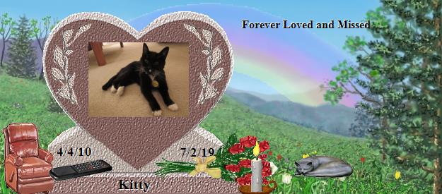 Dear Kitty, how purrfectly gorgeous you are! Please go to the Bridge and purr your precious love down the Rainbow straight into the heart of your dad who misses you so much, and he will send his love right back to you on angels' wings. Dear Mike, your world has lost a very special furpurrson, family member and friend, and heaven has welcomed Home a very special soul. Kitty is now your very own angel, watching over and for you, just as Jackie, Callie, Tashi, Katy and BG are watching over us, until you meet again and cross the Bride together. May her sweet presence continually nuzzle your heart until then, and may you find comfort in knowing that the silver thread of love that binds you heart to heart with Kitty will never be broken. Many blessings and much peace, Clare and Martha...Please visit our Jackie at https://www.rainbowsbridge.com/residents/JACKI010/resident.HTM