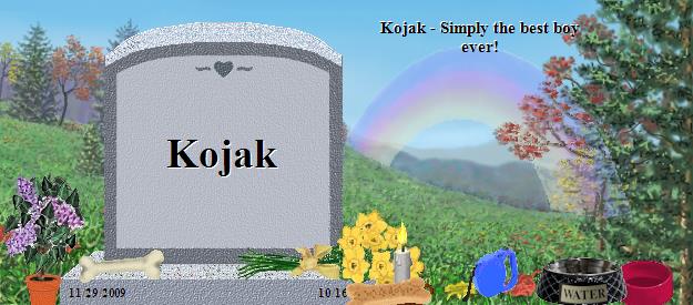 I am so sorry to hear about your loss of Kojak. Please find comfort in knowing that Kojak is now at Rainbows Bridge and making lots of friends. Saying goodbye is never easy. I also lost my precious cat Spooky July 30th, 2001, after 16 wonderful years with her. I have lost several babies since Spooky's passing. Hannah 1/11/13, Sammi 8/2/13, Maci 4/9/14, Gabbi 3/20/17, Zoe 1/3/18, Willow 6/4/18, Shelby 6/12/18, Bear 11/17/19, Bella and Murphy who were both tragically poisoned on 06/18/20, Firefly 12/20/22, and Zachary 02/19/23. I am sure that Kojak and my babies have all become good friends. You can visit with Spooky at: http://www.rainbowsbridge.com/residents/Spook002/resident.HTM Take Care, Susan