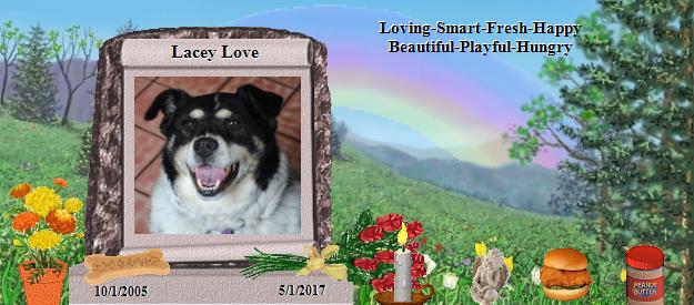 I want to ask you: Did Lacey Love have a positive impact on your lives? If you answer "yes", Lacey's job is done, and successfully! He now awaits you at Rainbow Bridge, for that one day in the future when you'll all rejoin her to cross the Bridge together.