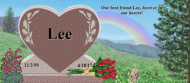 I am so sorry to hear about your loss of Lee. Please find comfort in knowing that Lee is now at Rainbows Bridge and making lots of friends. Saying goodbye is never easy. I also lost my precious cat Spooky July 30th 2001 after 16 wonderful years with her. On January 11, 2013, I lost my faithful friend Hannah who was a beautiful blue tick hound dog. On August 2, 2013 another one of my beautiful cats, Sammi, a black and white tabby, went to Rainbows Bridge. April 9, 2014, Maci, my English Bulldog passed over to Rainbows Bridge. Maci and Hannah were best friends. On March 20, 2017 my sweet little calico Gabbi crossed over Rainbow's Bridge. I adopted her about a month after Spooky passed away and Gabbi also lived to be almost 16 years old. I am sure that Lee and my babies have all become good friends. You can visit with Spooky at: http://www.rainbowsbridge.com/residents/Spook002/resident.HTM Take Care, Susan