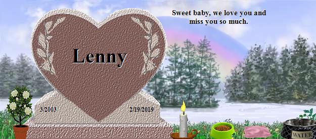 I am so sorry to hear about your loss of Lenny. Please find comfort in knowing that Lenny is now at Rainbows Bridge and making lots of friends. Saying goodbye is never easy. I also lost my precious cat Spooky July 30th 2001 after 16 wonderful years with her. I have lost several babies since Spooky's passing. Hannah 1/11/13, Sammi 8/2/13,Maci 4/9/14, Gabbi 3/20/17, Zoe 1/3/18, Willow 6/4/18, and Shelby 6/12/18. I am sure that Lenny and my babies have all become good friends. You can visit with Spooky at: http://www.rainbowsbridge.com/residents/Spook002/resident.HTM Take Care, Susan