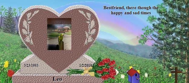 I am so sorry to hear about your loss of Leo. Please find comfort in knowing that Leo is now at Rainbows Bridge and making lots of friends. Saying goodbye is never easy. I also lost my precious cat Spooky July 30th 2001 after 16 wonderful years with her. I have lost several babies since Spooky's passing. Hannah 1/11/13, Sammi 8/2/13,Maci 4/9/14, Gabbi 3/20/17, Zoe 1/3/18, Willow 6/4/18, and Shelby 6/12/18. I am sure that Leo and my babies have all become good friends. You can visit with Spooky at: http://www.rainbowsbridge.com/residents/Spook002/resident.HTM Take Care, Susan
