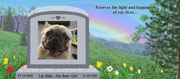 Dear Lily Belle, you are truly beautiful. Please go to the Bridge and send your precious love down the Rainbow straight into the hearts of your mama and daddy who miss you so much, and they will send their love right back to you on angels' wings. Dear Sara and Simon, your world has lost a very special furperson, family member and friend, and heaven has welcomed Home a very special soul. Lily Belle, your Baby Girl, is now your very own angel, watching over and for you, just as Jackie, Callie, Tashi, Katy and BG are watching over us, until you meet again and cross the Bridge together. May her sweet presence continually nuzzle your hearts until then, and may you find comfort in knowing that the silver thread of love that binds you heart to heart with Lily Belle will never be broken. Many blessings and much peace, Clare and Martha...Please visit our Jackie at https://www.rainbowsbridge.com/residents/JACKI010/resident.HTM