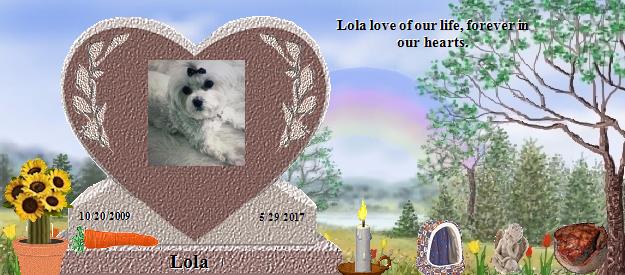 Lola, Your mommy and sisters have set up a beautiful memorial in your honor. What a very loving home you had. When you get a chance send them a sign down from the bridge just to let them know you are always watching over them. You are so very missed and will never be forgotten by your family. What a huge print you left in their lives.
