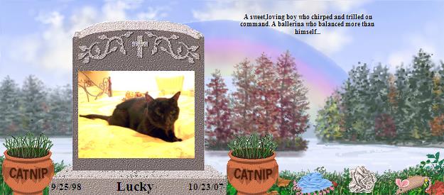 My thoughts are with you. This brought a tear to my eyes...What a wonderful cat he was. Touching life story of Lucky...
