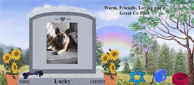 I am so sorry to hear about your loss of Lucky. Please find comfort in knowing that Lucky is now at Rainbows Bridge and making lots of friends. Saying goodbye is never easy. I also lost my precious cat Spooky July 30th, 2001, after 16 wonderful years with her. I have lost several babies since Spooky's passing. Hannah 1/11/13, Sammi 8/2/13, Maci 4/9/14, Gabbi 3/20/17, Zoe 1/3/18, Willow 6/4/18, Shelby 6/12/18, Bear 11/17/19, Bella and Murphy who were both tragically poisoned on 06/18/20, and Firefly 12/20/22. I am sure that Lucky and my babies have all become good friends. You can visit with Spooky at: http://www.rainbowsbridge.com/residents/Spook002/resident.HTM Take Care, Susan