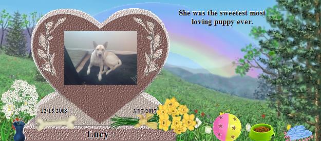 I am so sorry to hear about your loss of Lucy. Please find comfort in knowing that Lucy is now at Rainbows Bridge and making lots of friends. Saying goodbye is never easy. I also lost my precious cat Spooky July 30th 2001 after 16 wonderful years with her. On January 11, 2013, I lost my faithful friend Hannah who was a beautiful blue tick hound dog. On August 2, 2013 another one of my beautiful cats, Sammi, a black and white tabby, went to Rainbows Bridge. April 9, 2014, Maci, my English Bulldog passed over to Rainbows Bridge. Maci and Hannah were best friends. On March 20, 2017 my sweet little calico Gabbi crossed over Rainbow's Bridge. I adopted her about a month after Spooky passed away and Gabbi also lived to be almost 16 years old. I am sure that Lucy and my babies have all become good friends. You can visit with Spooky at: http://www.rainbowsbridge.com/residents/Spook002/resident.HTM Take Care, Susan