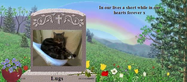 Dear Lugs, you are truly cherished! Please go to the Bridge and send your precious love down the Rainbow straight into the heart of your mummy who misses you so much, and she will send her love right back to you on angels' wings. Maeve, your world has lost a very special furperson, family member and friend, and heaven has welcomed home a very special soul. Lugs is now your very own angel, watching over and for you, just as Tashi, Katy and BG are watching over us, until you meet again and cross the Bridge together. May his sweet love continually hug your heart until then, and may you find comfort in knowing that the silver thread of love that binds you heart to heart with Lugs will never be broken. Blessings and peace, Clare and Martha...Please visit our Tashi at http://www.rainbowsbridge.com/residents/TASHI002/resident.HTM